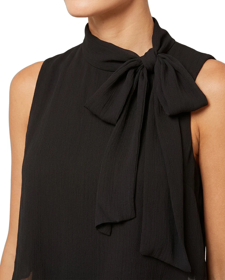 • High neckline with self tie; concealed back zipper with hook-and-eye closure